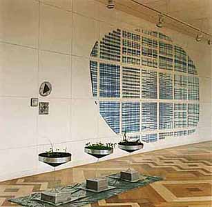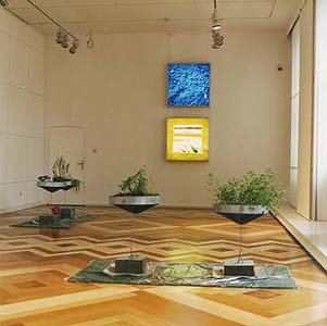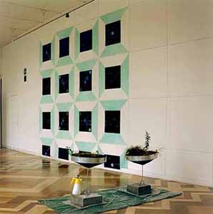 Show-window containing shells, earth, pigments, fat and oil BOOM / TREE colourpencil on paper drawing in gilded frame, 50 x 50 cm 3 copies of drawings 2 - 90 x 90cm 1 - 50 x 50cm
